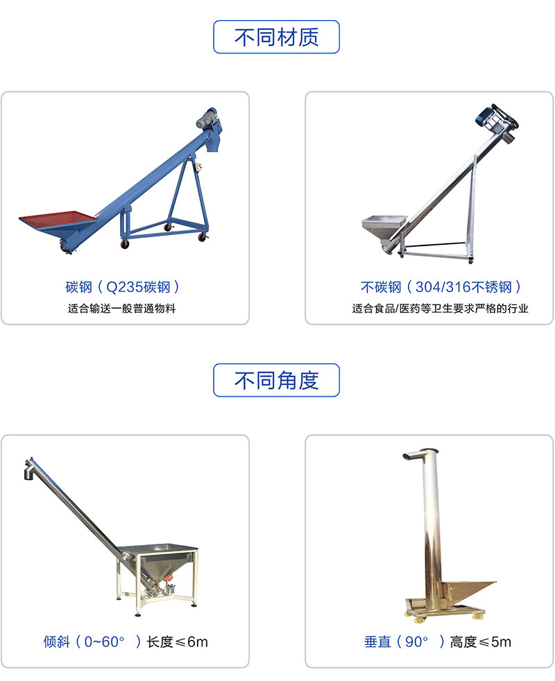 垂直螺旋給料機:90°垂直向上輸送物料,轉速比普通螺旋輸送機要高,提升高度一般不大于8米。